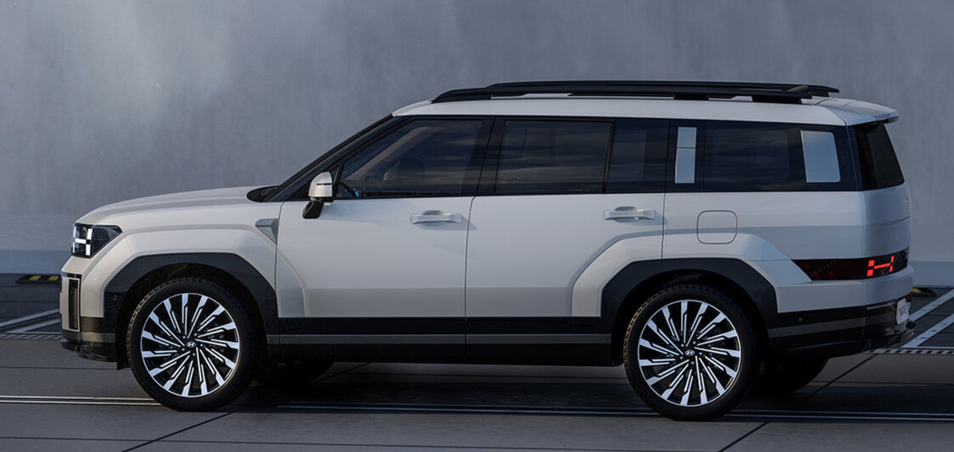 El nuevo Santa Fe presenta una forma cuadrada y una silueta distintiva derivada de su larga distancia entre ejes y su amplia área de puerta trasera. La parte delantera del vehículo crea un aspecto imponente con su capó alto, faros en forma de H y guardabarros audaces. Los elementos de diseño en forma de H reinterpretan el emblema «H» de Hyundai. La distancia alargada entre ejes acomoda una línea de techo audaz, un volumen potente alrededor de los guardabarros, arcos de rueda definidos de manera nítida, voladizos delanteros acortados y ruedas de 21 pulgadas. La parte trasera está equilibrada y simplificada con luces traseras en forma de H.